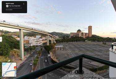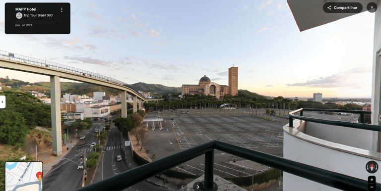 Tour virtual aéreo e interno que valoriza a localização estratégica próxima ao Santuário de Aparecida. A experiência em 360° reforça credibilidade e aumenta a taxa de reservas no hotel.
