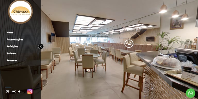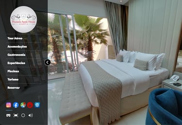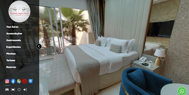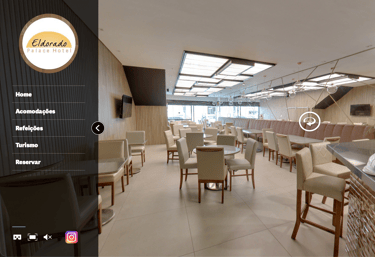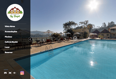 Site interativo completo com tours 360° das acomodações, áreas de lazer e gastronomia, trazendo a experiência da hospedagem antes mesmo da reserva