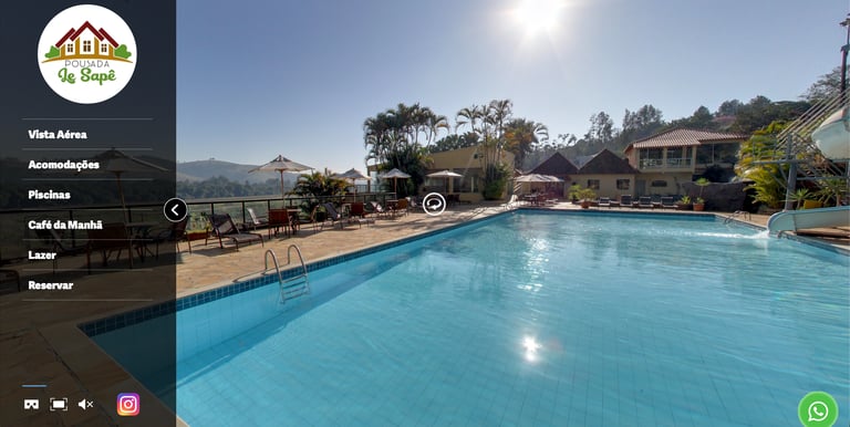 Tour 360° imersivo no site, destacando piscinas, acomodações e áreas de lazer com menus intuitivos para engajar hóspedes e aumentar reservas.